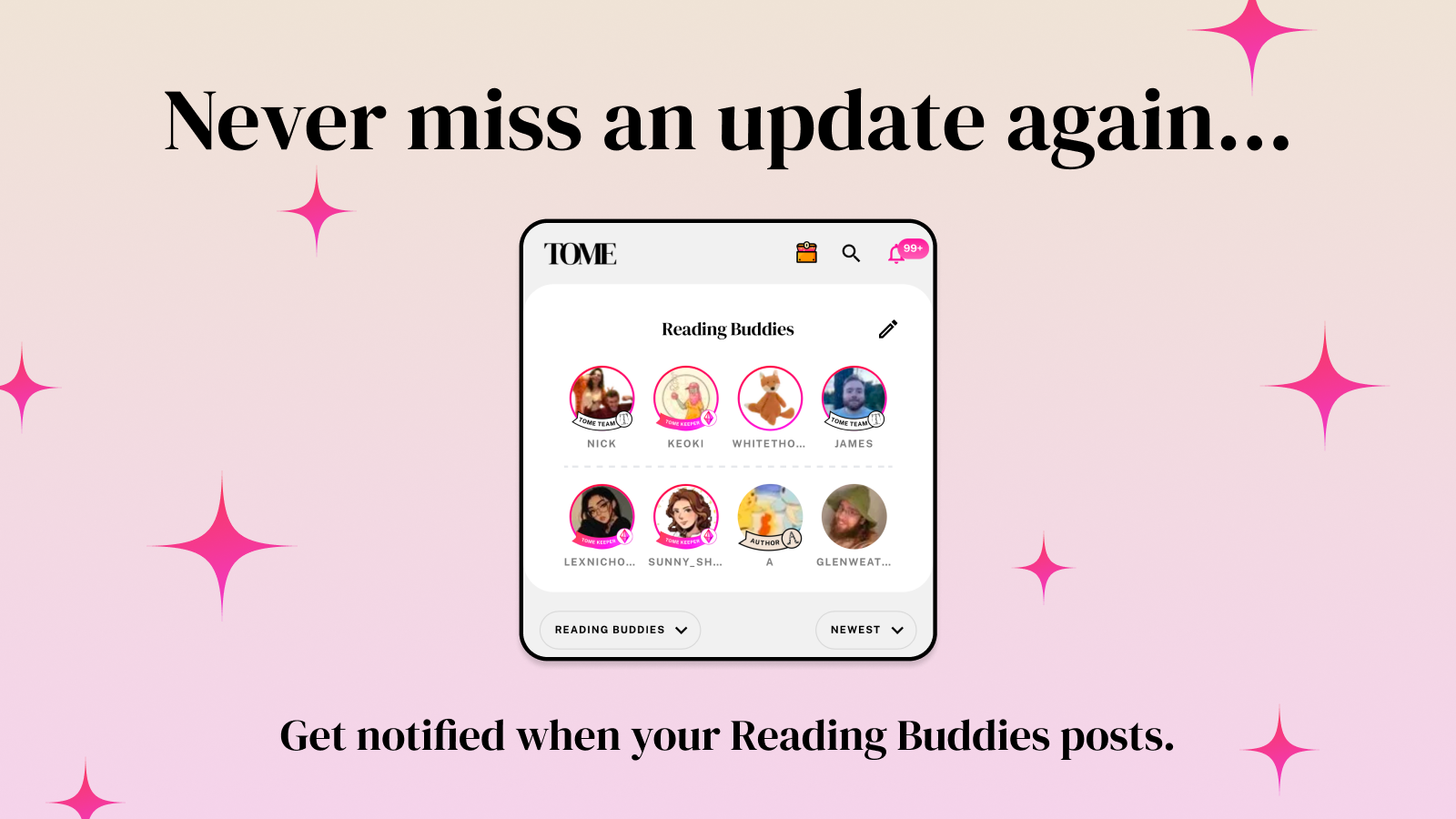 Pick up to eight close friends and get notified when they post on Tome! This is excellent for buddy reads, staying up-to-date with your book bestie, or making sure you don’t miss your favorite creator’s posts